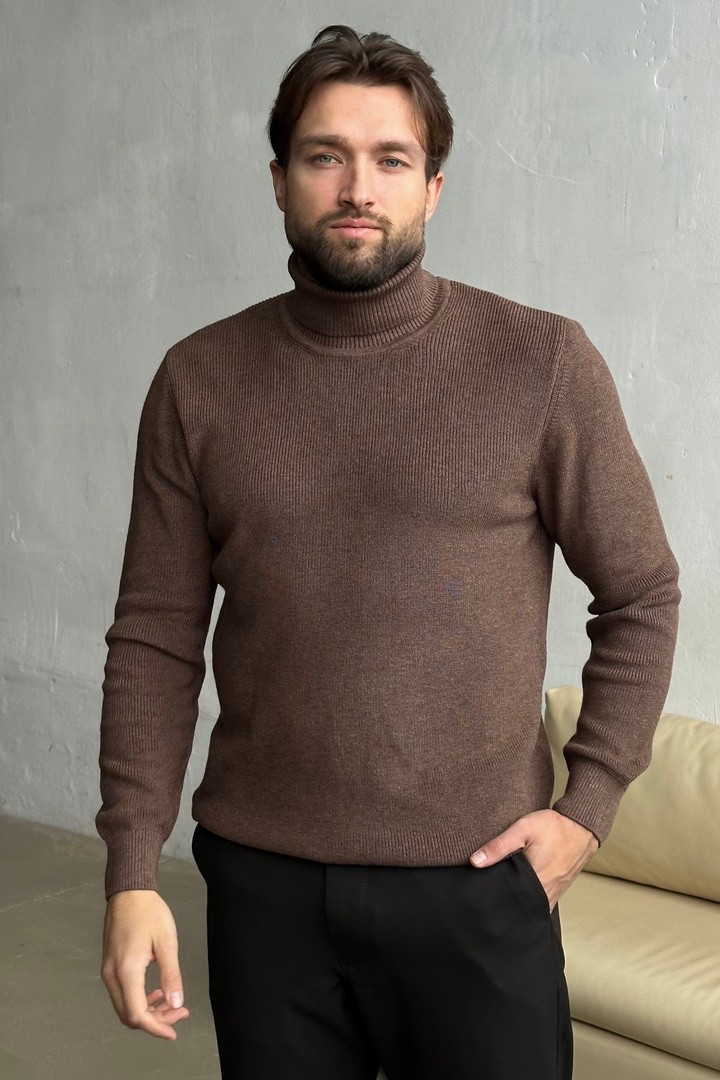 Бадлон коричневого цвета с высоким горлом — стильная базовая вещь в мужском гардеробе.