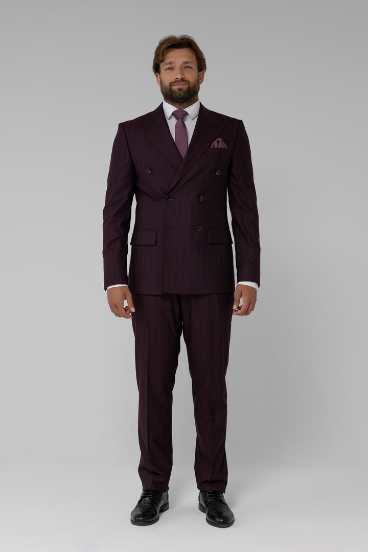 Этот двубортный костюм — гармоничное сочетание классики и современных тенденций. Он создан для тех, кто ценит необычные цветовые решения и стремится выглядеть безупречно, не боясь выходить за рамки привычных стереотипов. Полоска и баклажановый цвет создают неповторимый дуэт, который будет привлекать восхищённые взгляды.