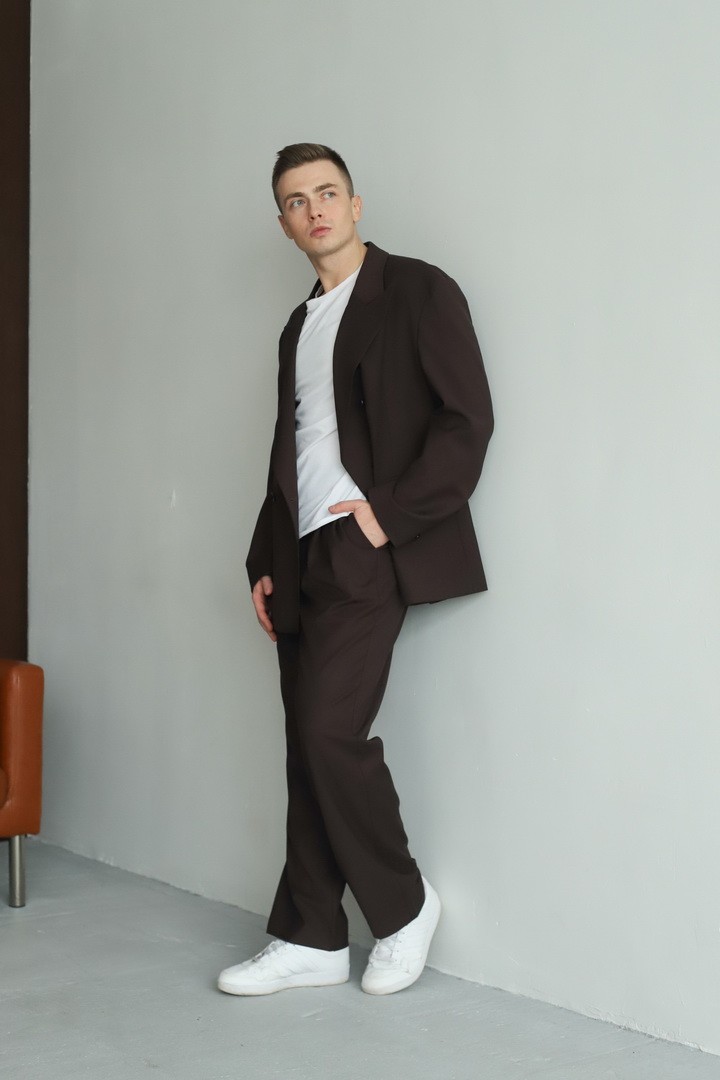 Мужской костюм оверсайз в коричневом цвете — лаконичная элегантность без излишней строгости. Свободный крой дарит комфорт и подвижность, а благородный оттенок коричневого добавляет образу теплоты и глубины. Универсальное решение для тех, кто ценит современный силуэт и сдержанную харизматичность в повседневных и деловых сочетаниях.