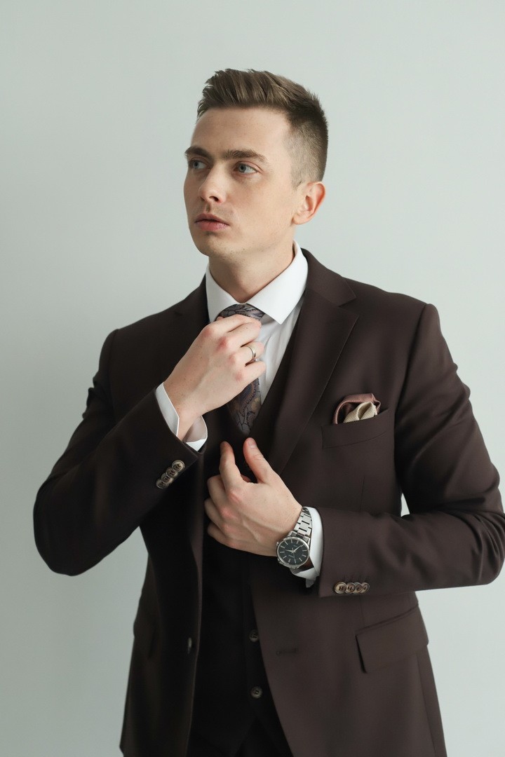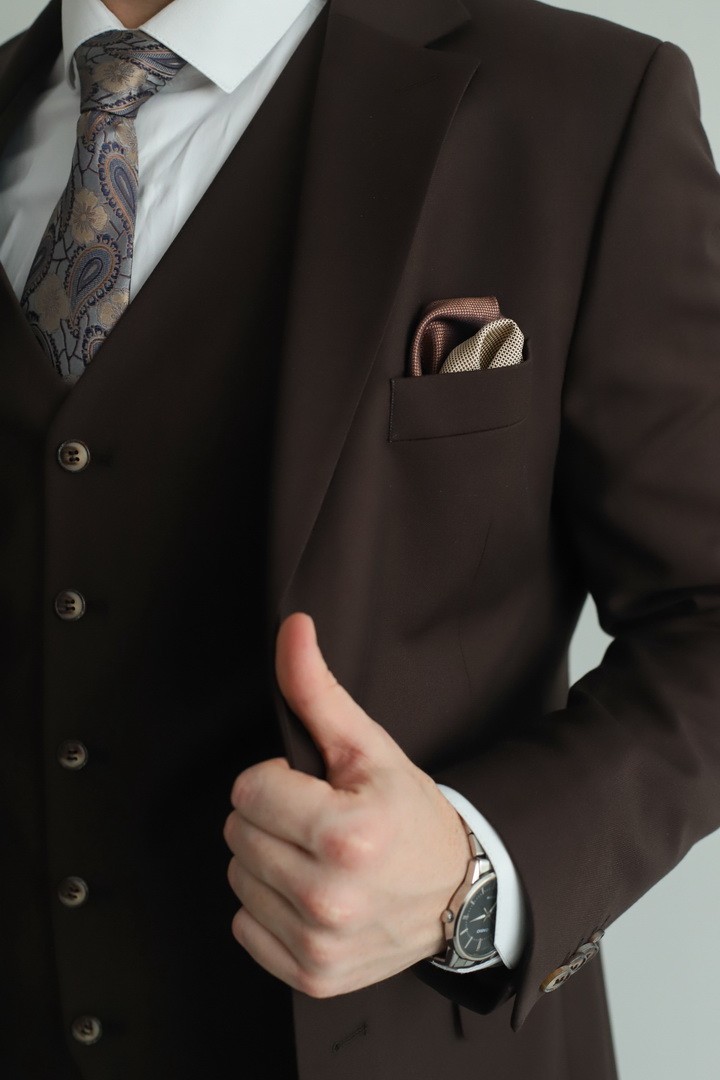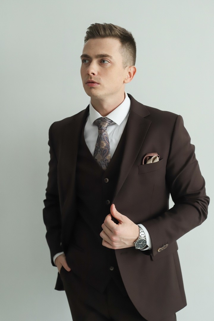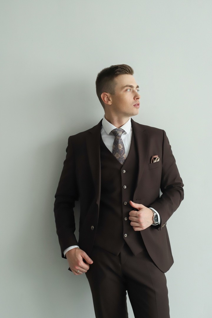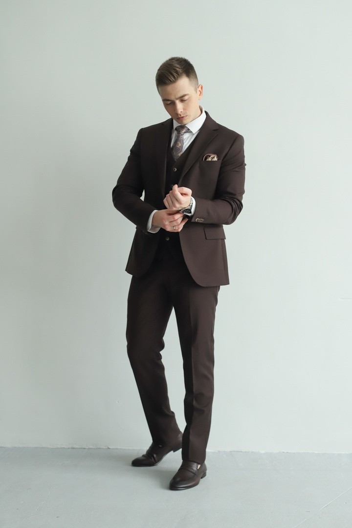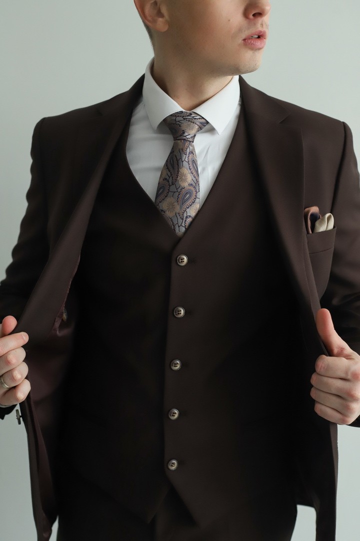 Мужской костюм‑тройка в тёмно‑коричневом цвете — воплощение сдержанной элегантности и безупречного вкуса. Жилет, пиджак и брюки создают гармоничный ансамбль, подчёркивающий статус и чувство стиля. Глубокий оттенок придаёт образу благородную теплоту, а классический крой гарантирует универсальность: подойдёт как для деловых мероприятий, так и для торжественных событий.