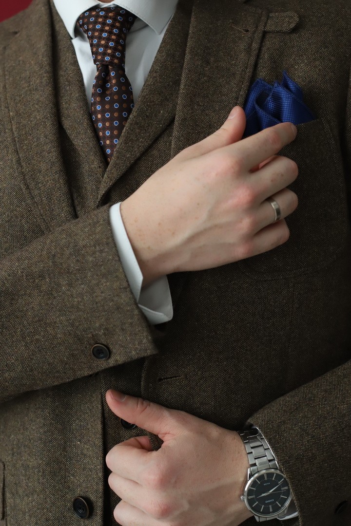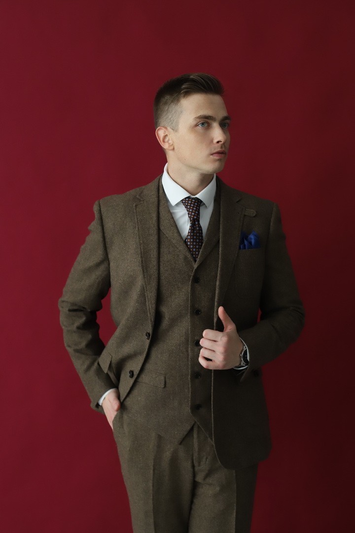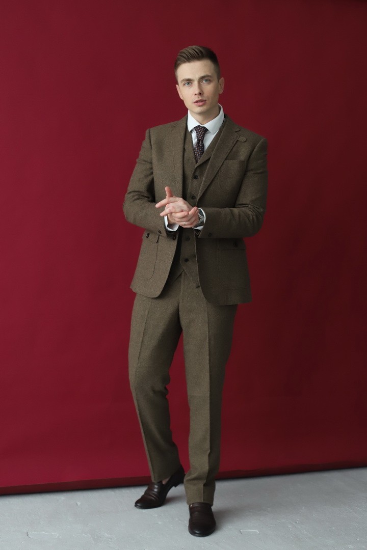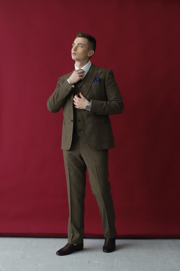 Мужской костюм‑тройка горчичного цвета — смелое сочетание классики и современного стиля. Жилет, пиджак и брюки в этом выразительном оттенке создают яркий, но не кричащий ансамбль, который подчеркнёт индивидуальность и чувство моды. Универсальный вариант для деловых встреч, торжественных мероприятий и стильных городских образов: тёплый, насыщенный тон гармонично сочетается как с нейтральными, так и с контрастными цветами.