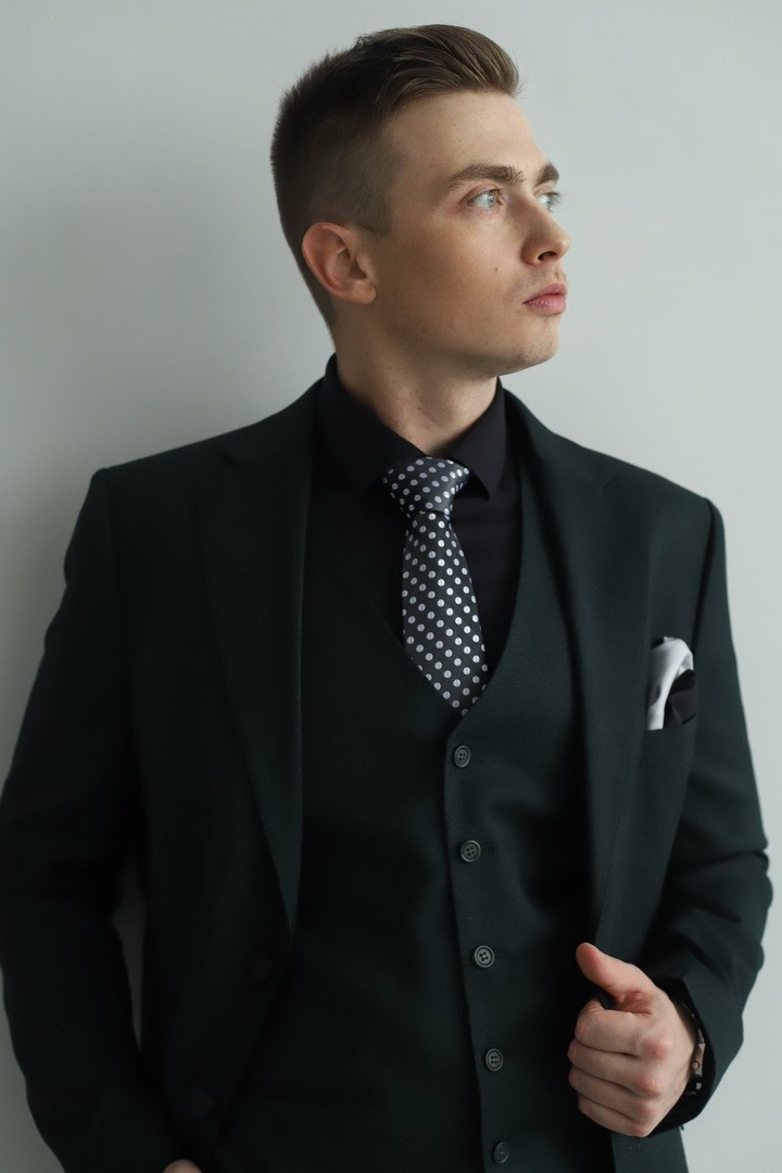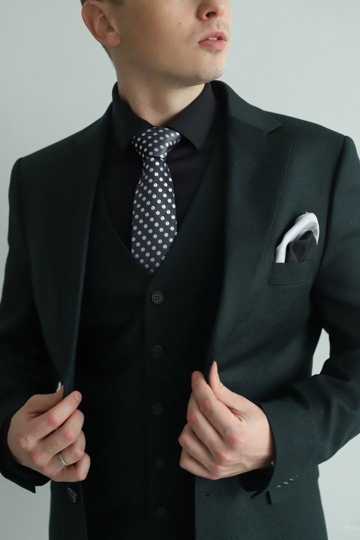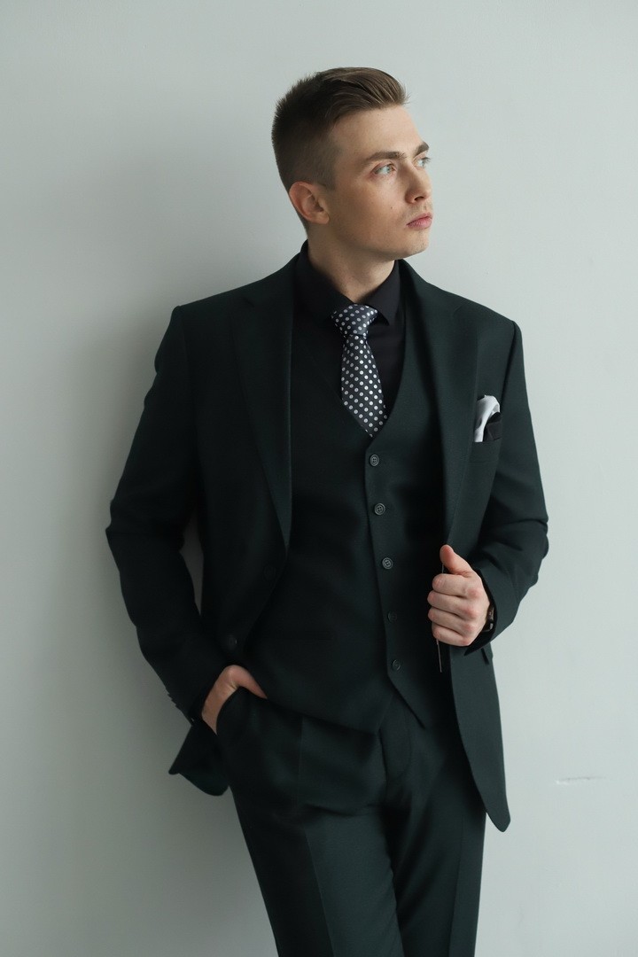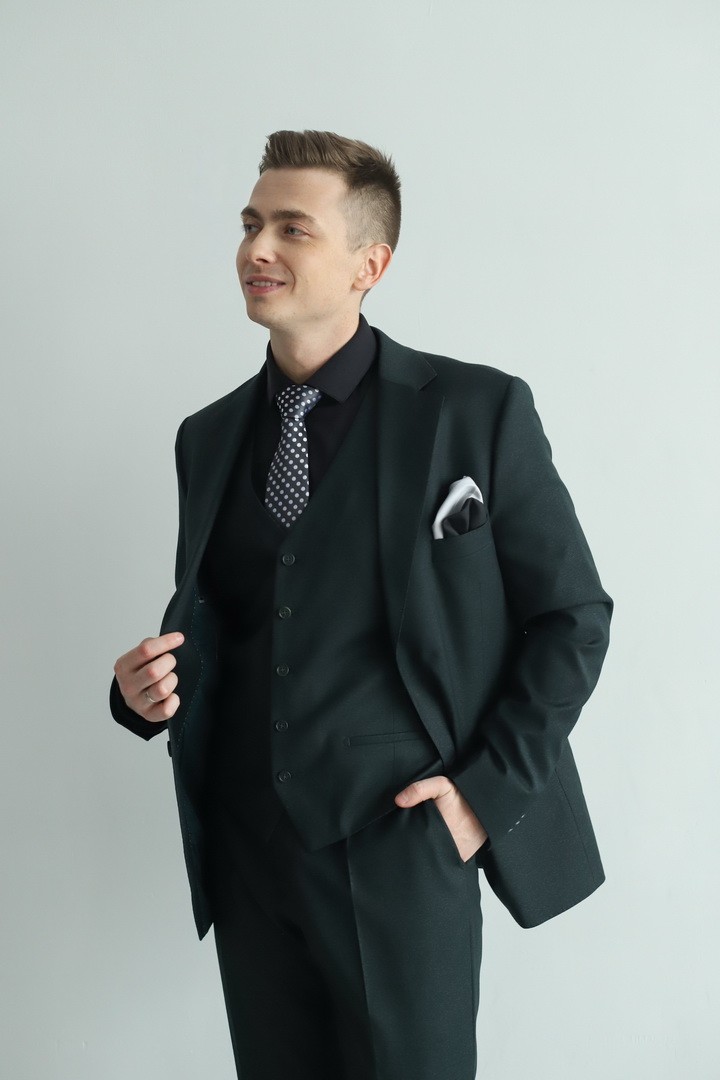Мужской костюм‑тройка тёмно‑зелёного цвета — воплощение природной элегантности и уверенного стиля. Насыщенный оттенок придаёт образу глубину и благородство, а классический крой тройки подчёркивает безупречный вкус владельца. Комплект из пиджака, жилета и брюк создаёт гармоничный силуэт, уместный как в деловой среде, так и на торжественных мероприятиях. Это выбор мужчины, который ценит классические формы и выразительные, но не кричащие цветовые решения.