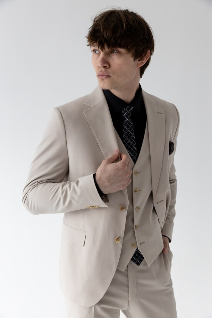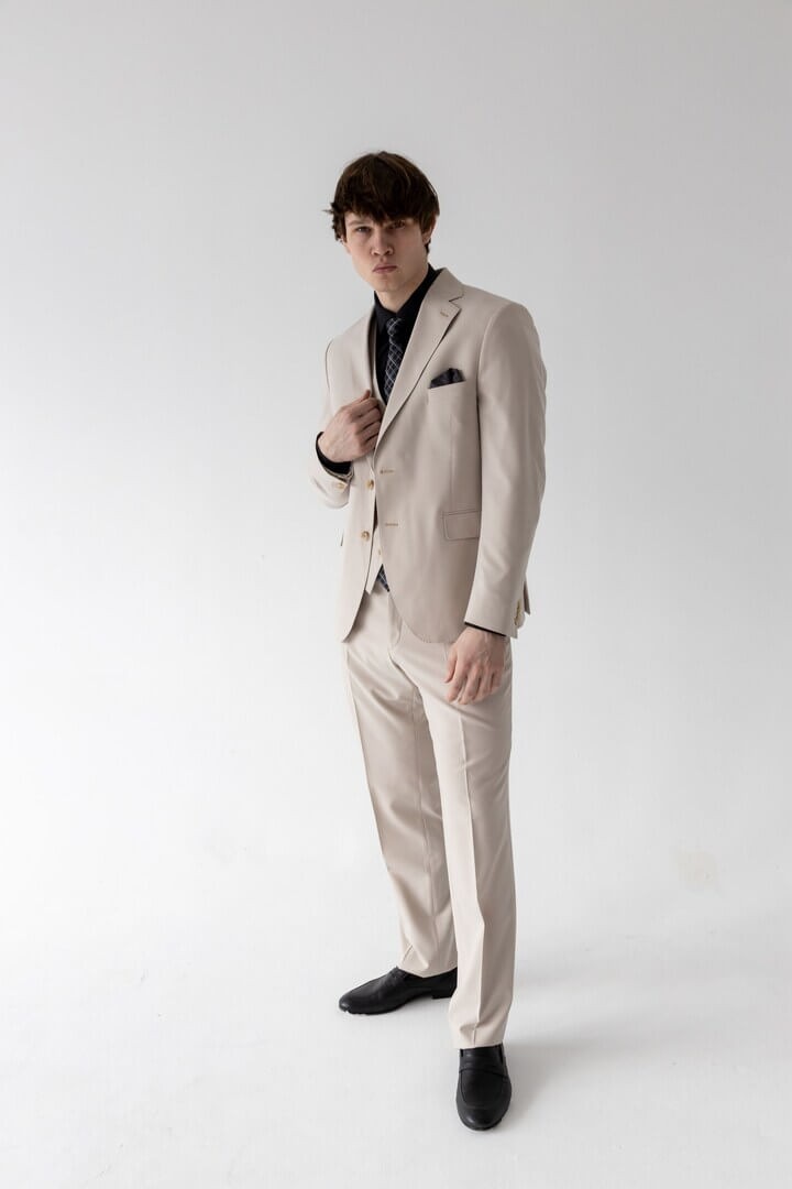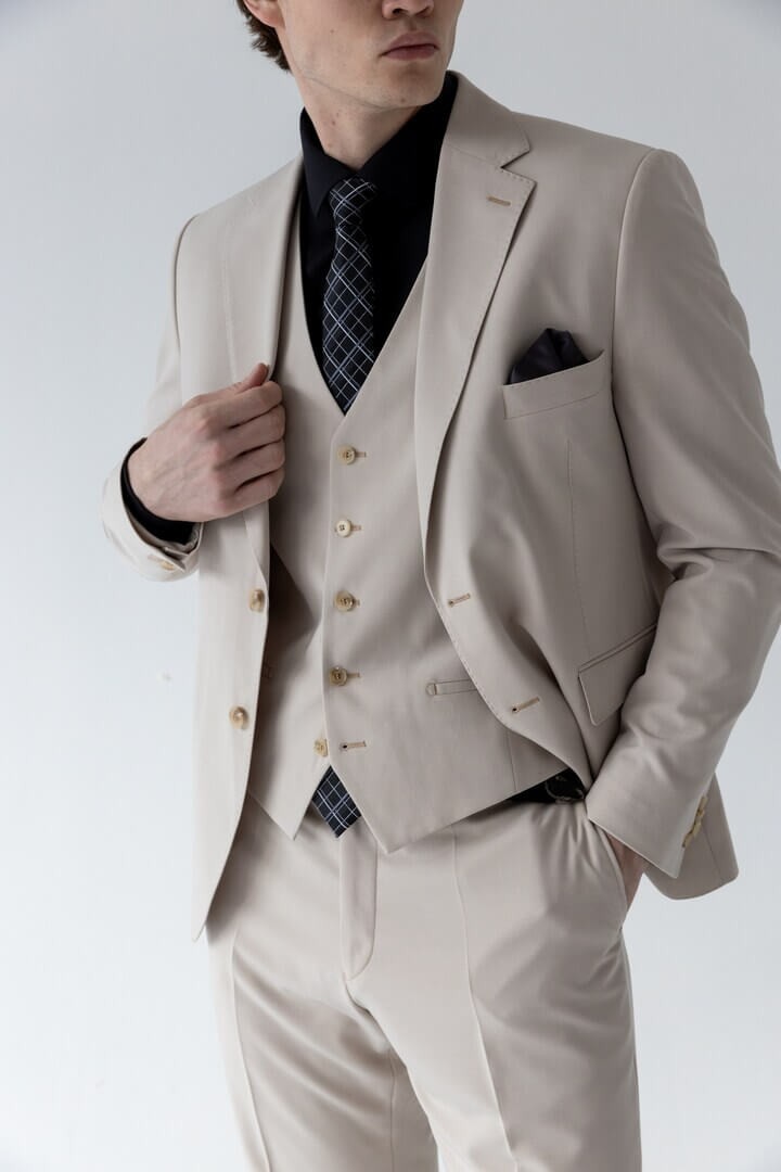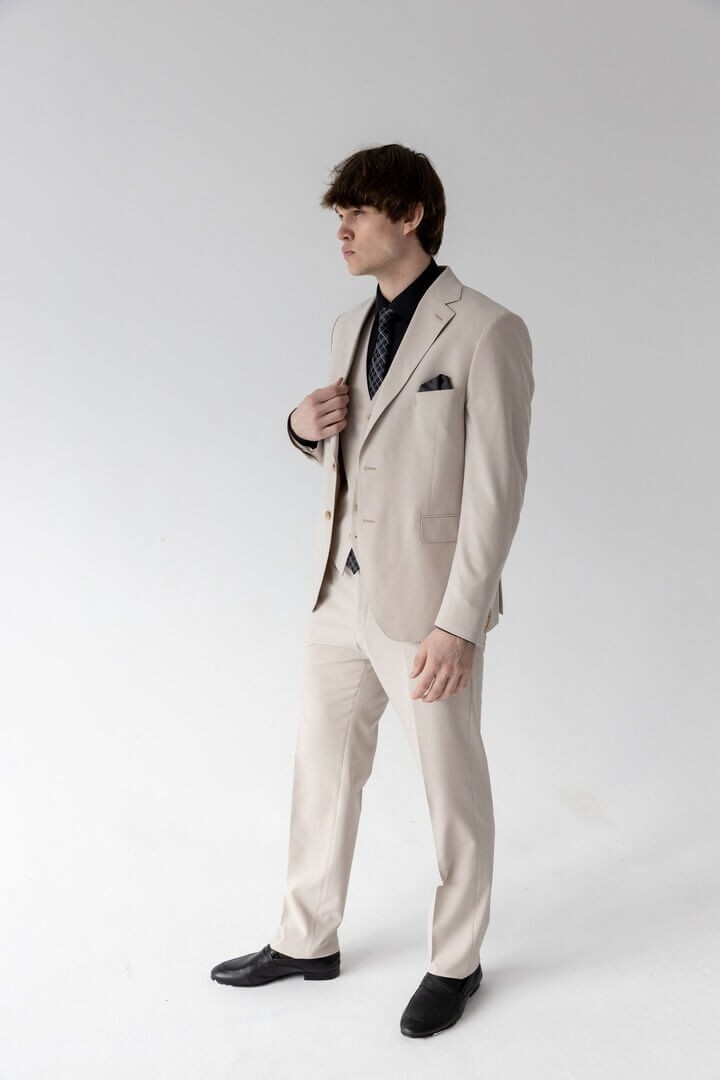 Бежевая тройка в классическом стиле — выбор уверенного в себе мужчины: прямоугольный лацкан задаёт строгий тон, боковые карманы с клапаном сочетают практичность и традиционную эстетику, а нагрудный карман ненавязчиво намекает на возможность добавить образу изысканную ноту с помощью платка.