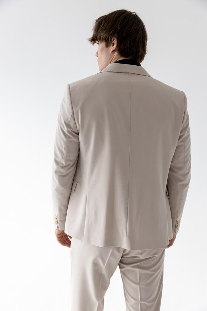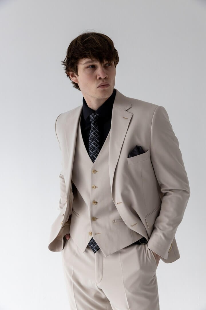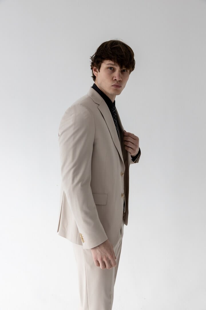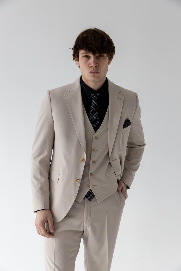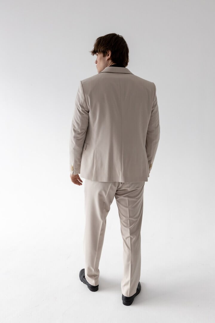 Бежевая тройка в классическом стиле — выбор уверенного в себе мужчины: прямоугольный лацкан задаёт строгий тон, боковые карманы с клапаном сочетают практичность и традиционную эстетику, а нагрудный карман ненавязчиво намекает на возможность добавить образу изысканную ноту с помощью платка.