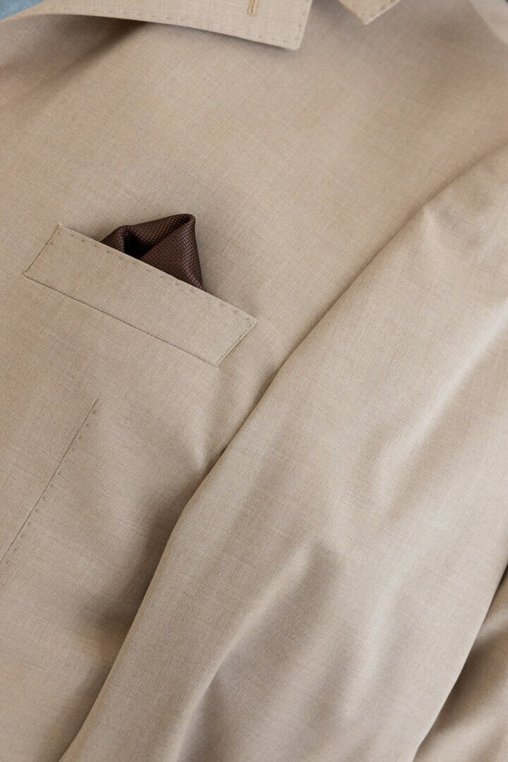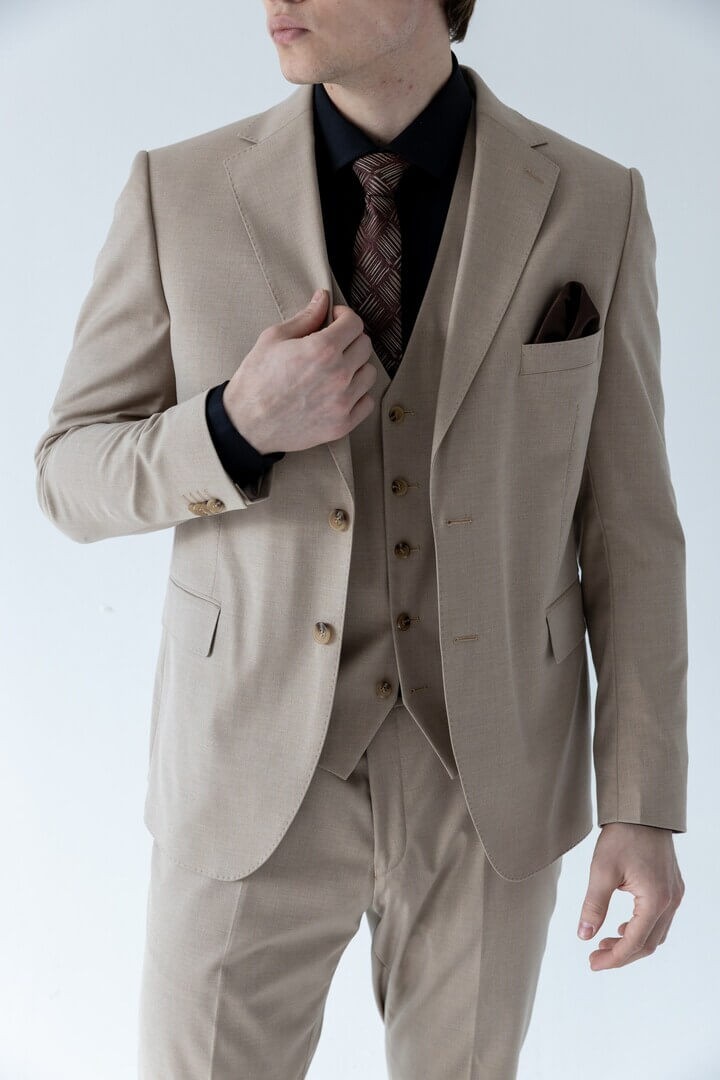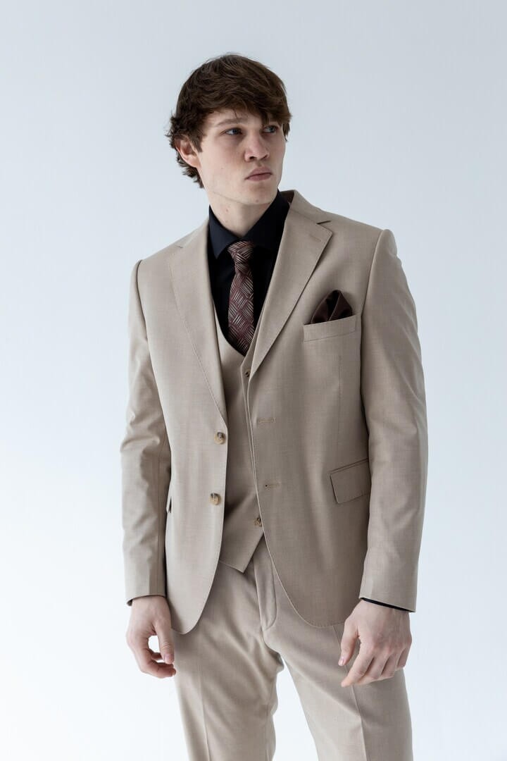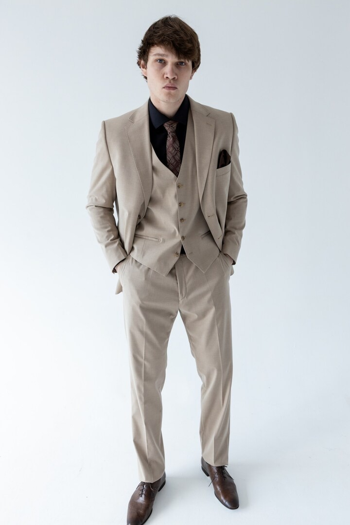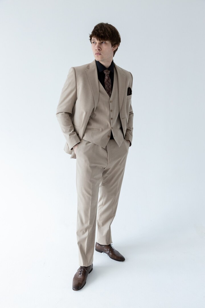 Безупречная классика в бежевых тонах — мужской костюм‑тройка, где каждая деталь говорит о вкусе своего владельца. Прямоугольный лацкан придаёт силуэту чёткость и благородную строгость, боковые карманы с лаконичным клапаном гармонично вписываются в общий силуэт, не нарушая его целостности, а изящный нагрудный карман словно приглашает дополнить образ шёлковым платком — чтобы добавить ноту утончённой элегантности в безупречный ансамбль.