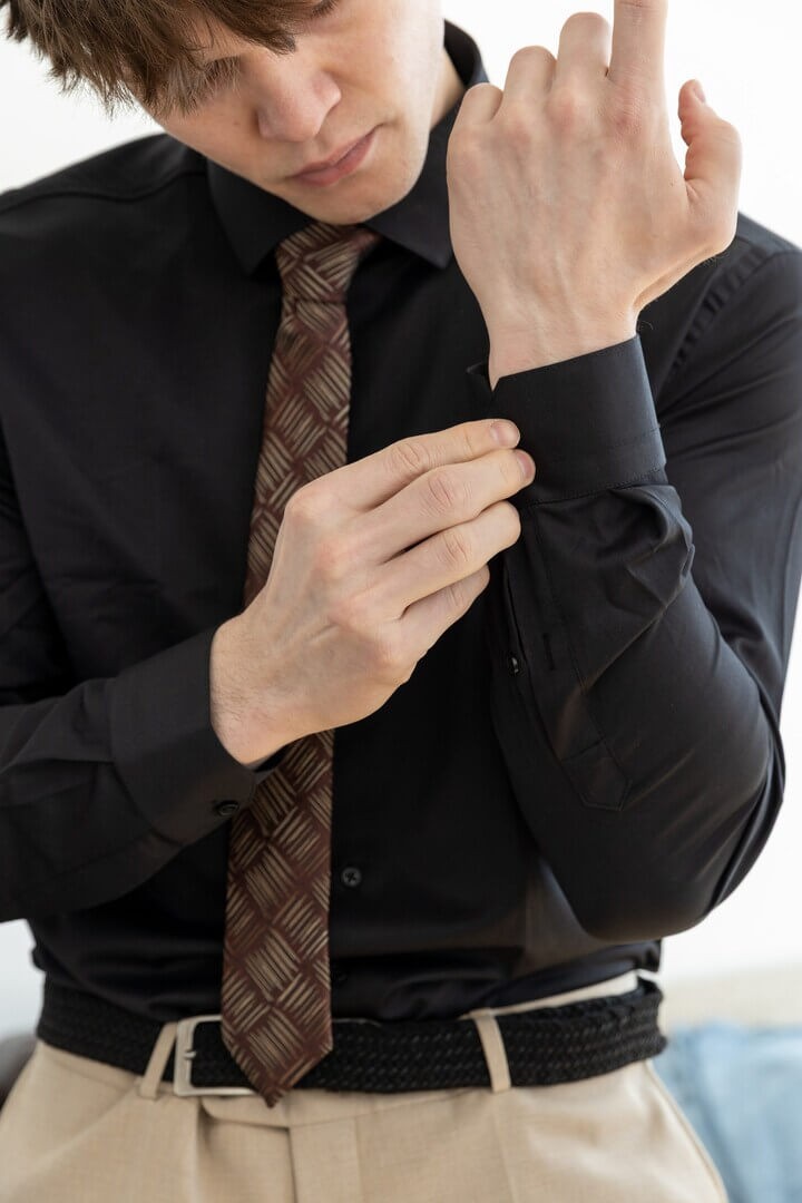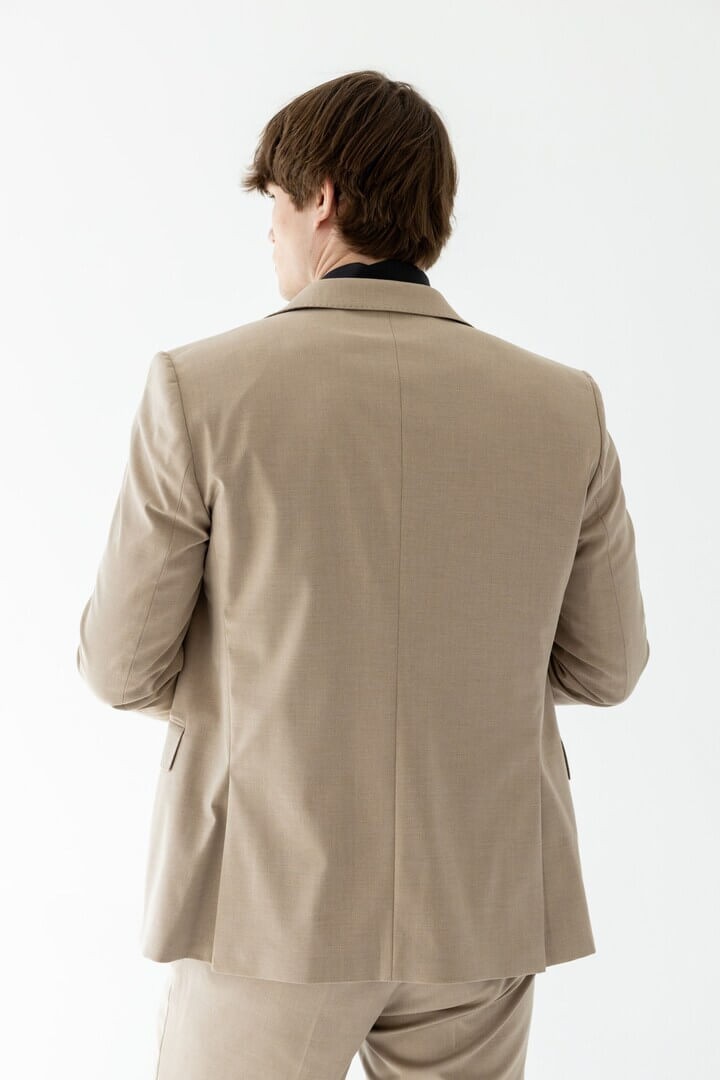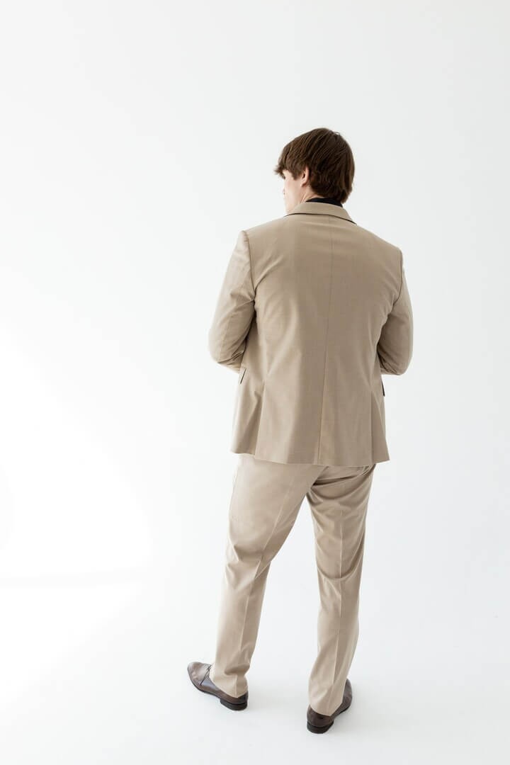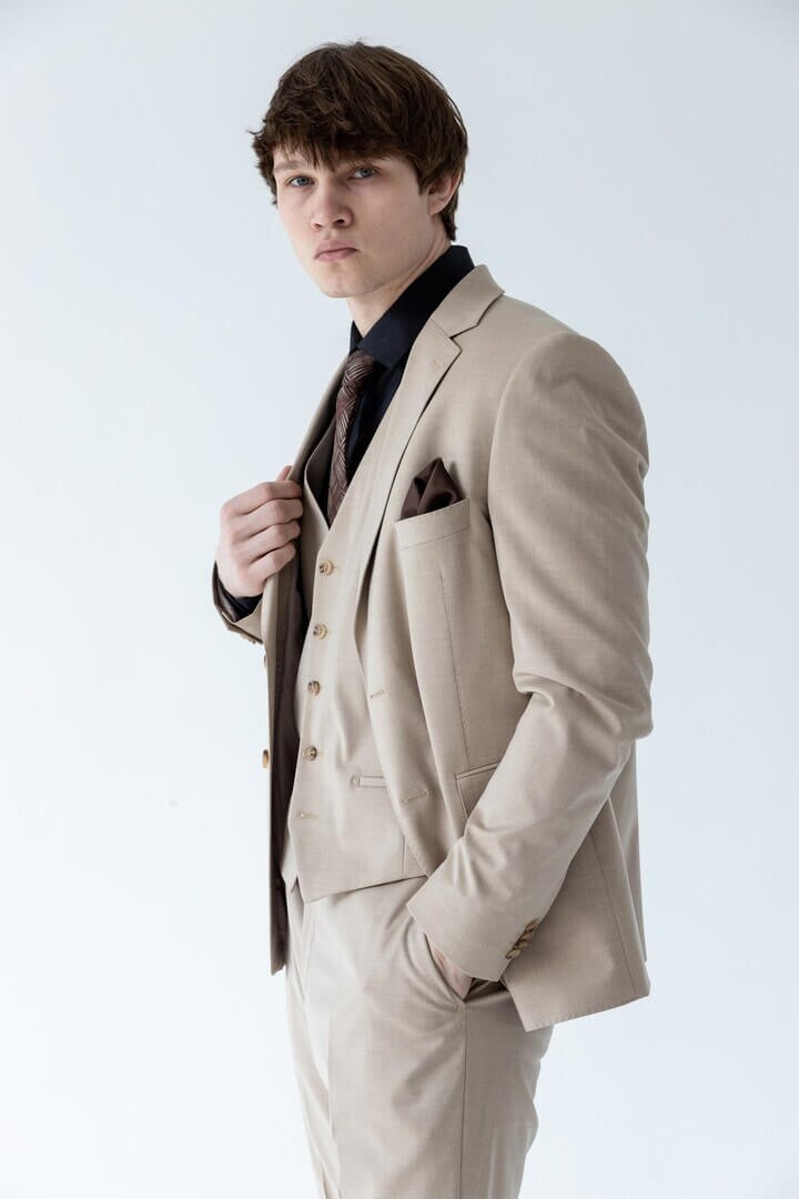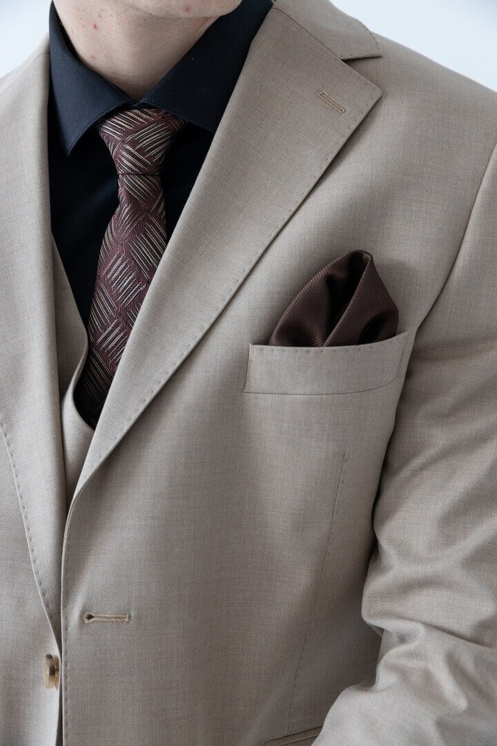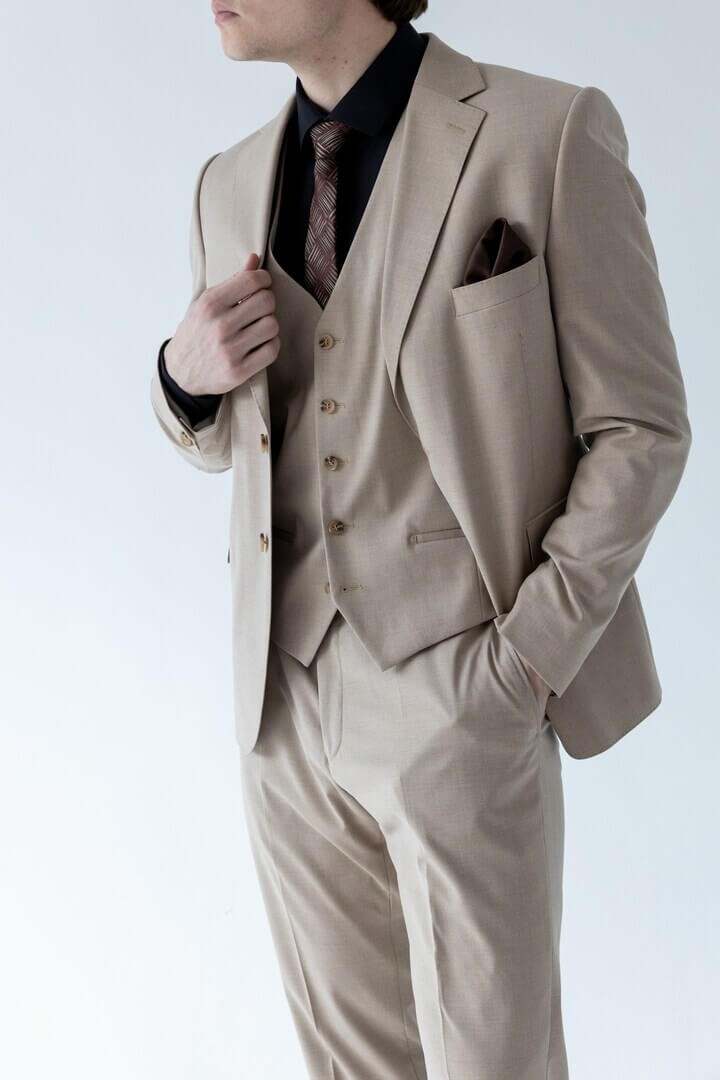 Безупречная классика в бежевых тонах — мужской костюм‑тройка, где каждая деталь говорит о вкусе своего владельца. Прямоугольный лацкан придаёт силуэту чёткость и благородную строгость, боковые карманы с лаконичным клапаном гармонично вписываются в общий силуэт, не нарушая его целостности, а изящный нагрудный карман словно приглашает дополнить образ шёлковым платком — чтобы добавить ноту утончённой элегантности в безупречный ансамбль.