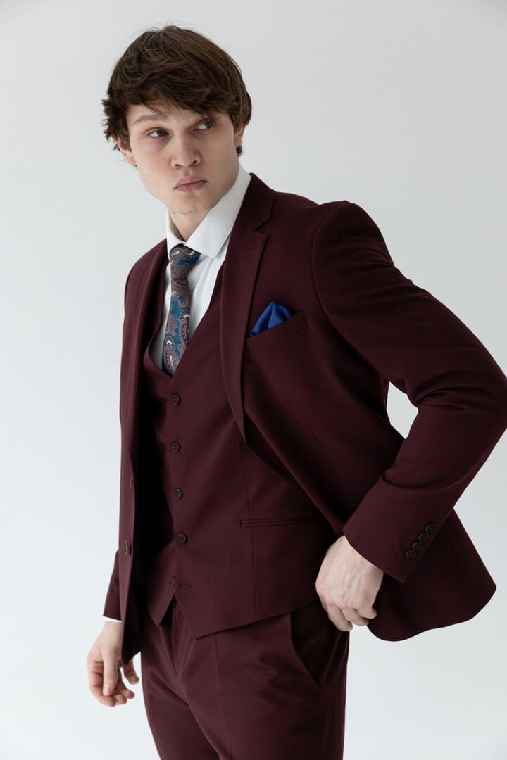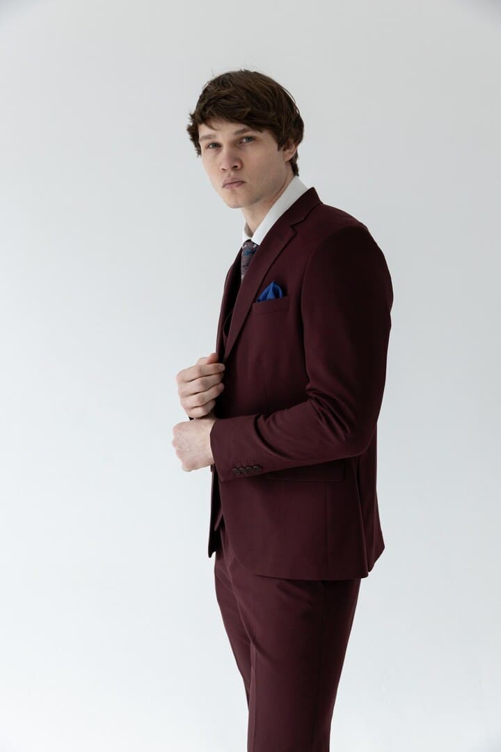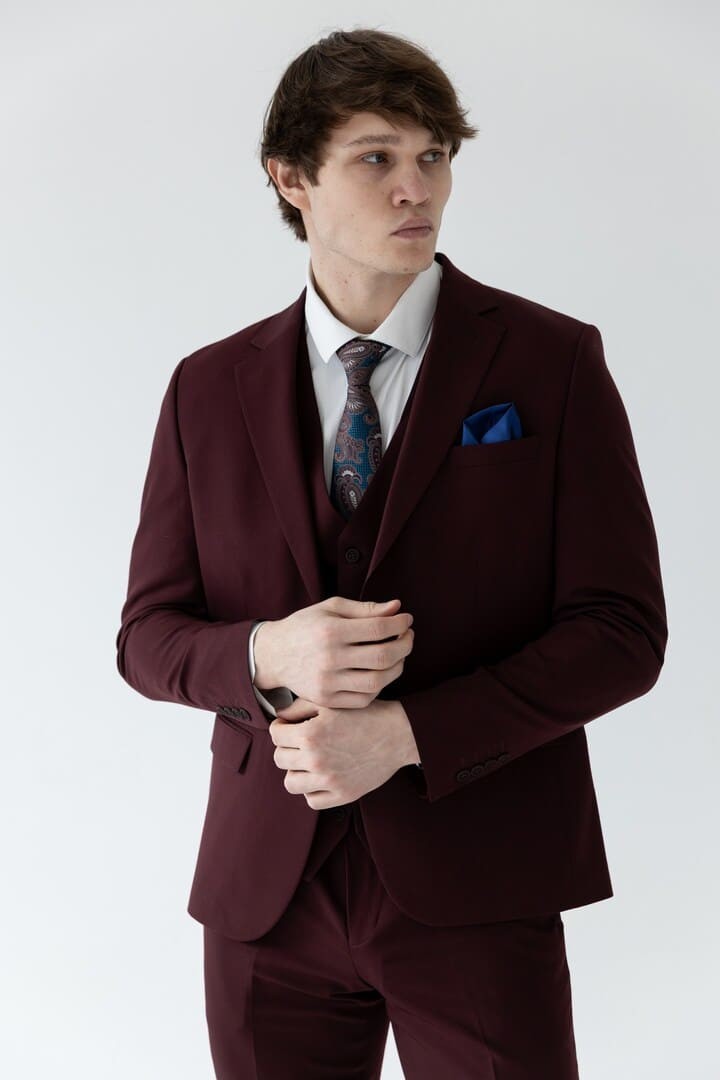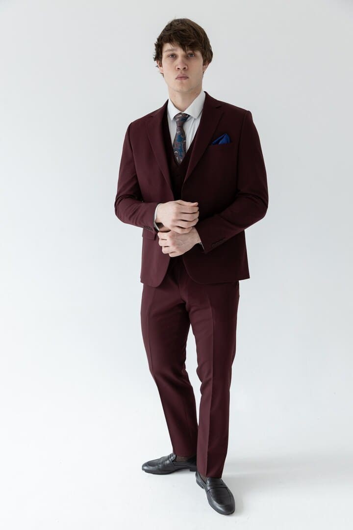 Классический костюм‑тройка бордового цвета — смелое воплощение элегантности, где традиция встречается с индивидуальностью. Насыщенный благородный оттенок притягивает взгляды, подчёркивая характер и уверенность своего владельца, а строгий прямоугольный лацкан придаёт силуэту чёткость и деловую собранность.
