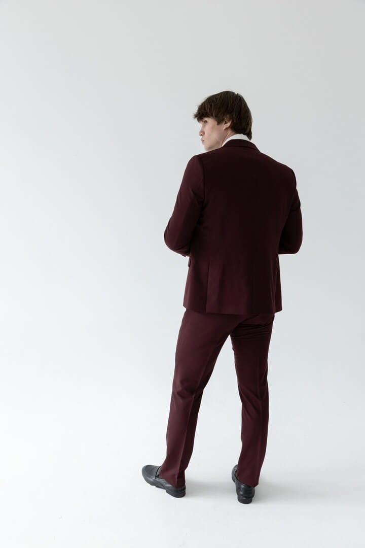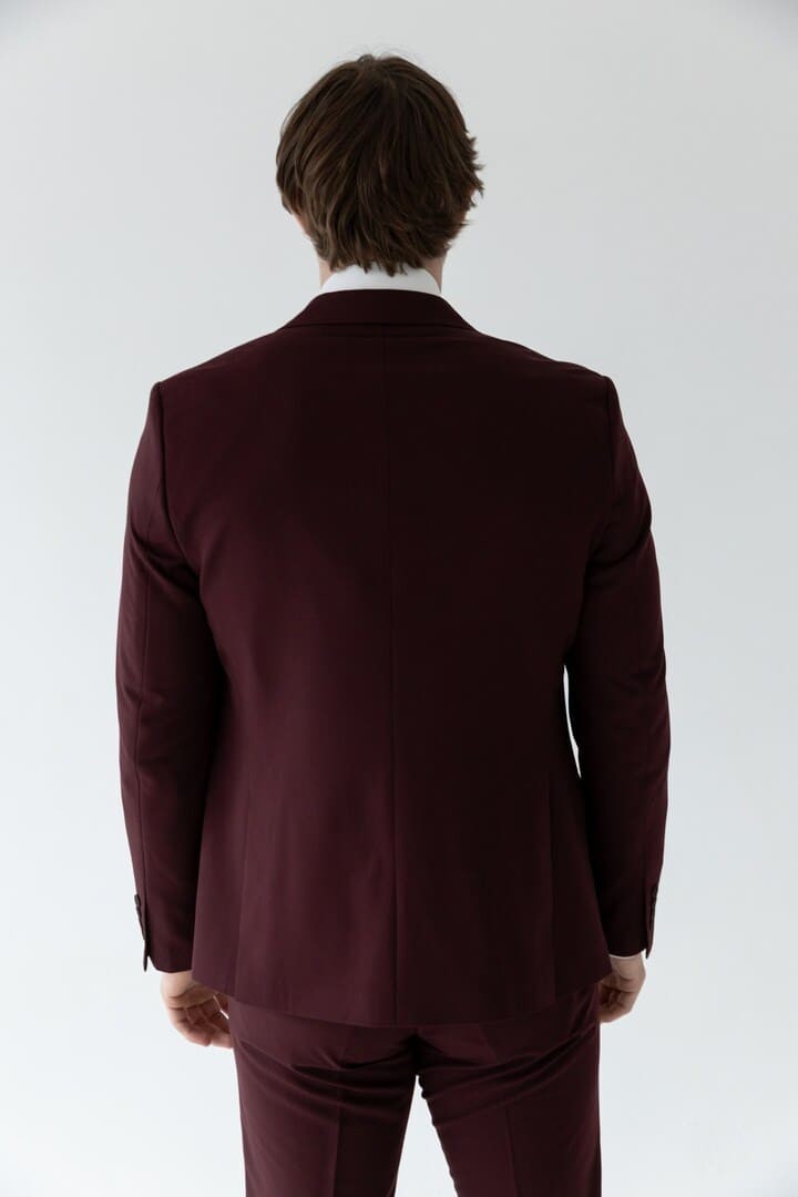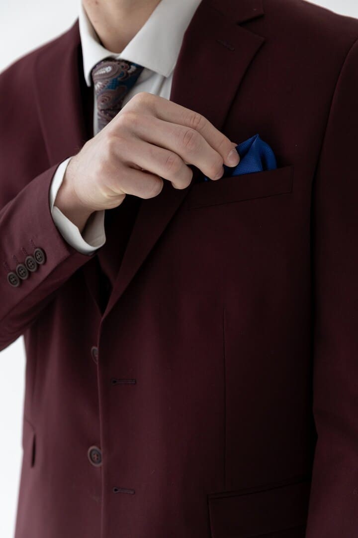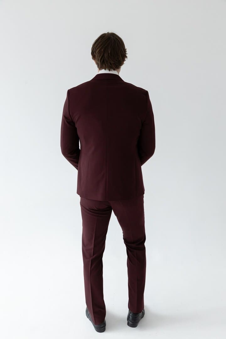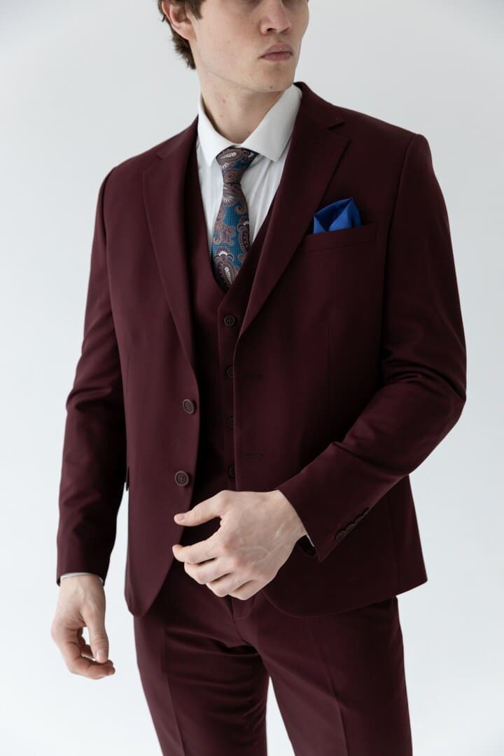 Классический костюм‑тройка бордового цвета — смелое воплощение элегантности, где традиция встречается с индивидуальностью. Насыщенный благородный оттенок притягивает взгляды, подчёркивая характер и уверенность своего владельца, а строгий прямоугольный лацкан придаёт силуэту чёткость и деловую собранность.