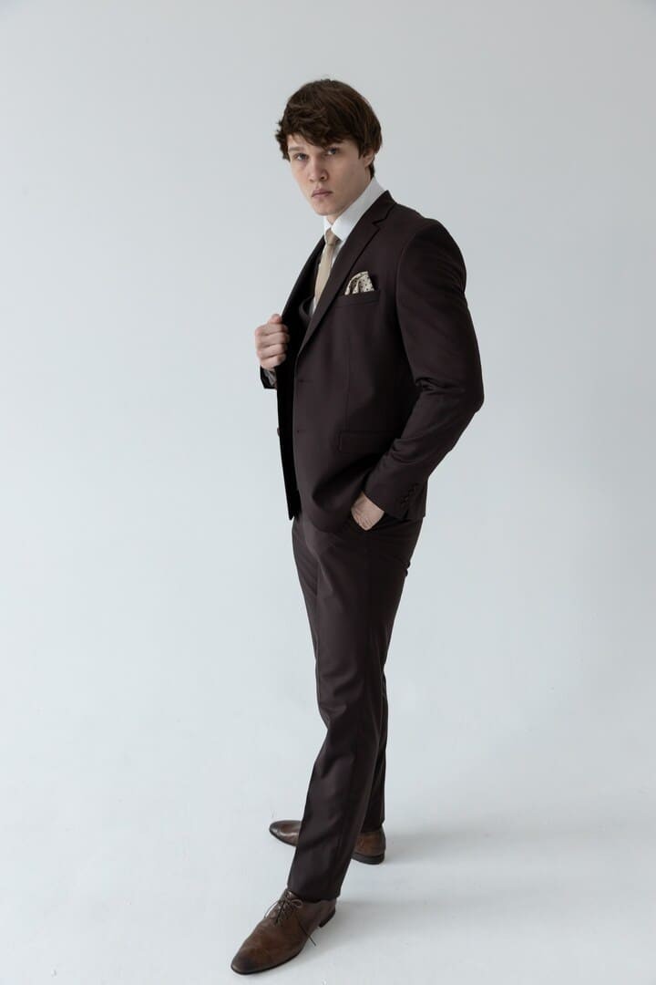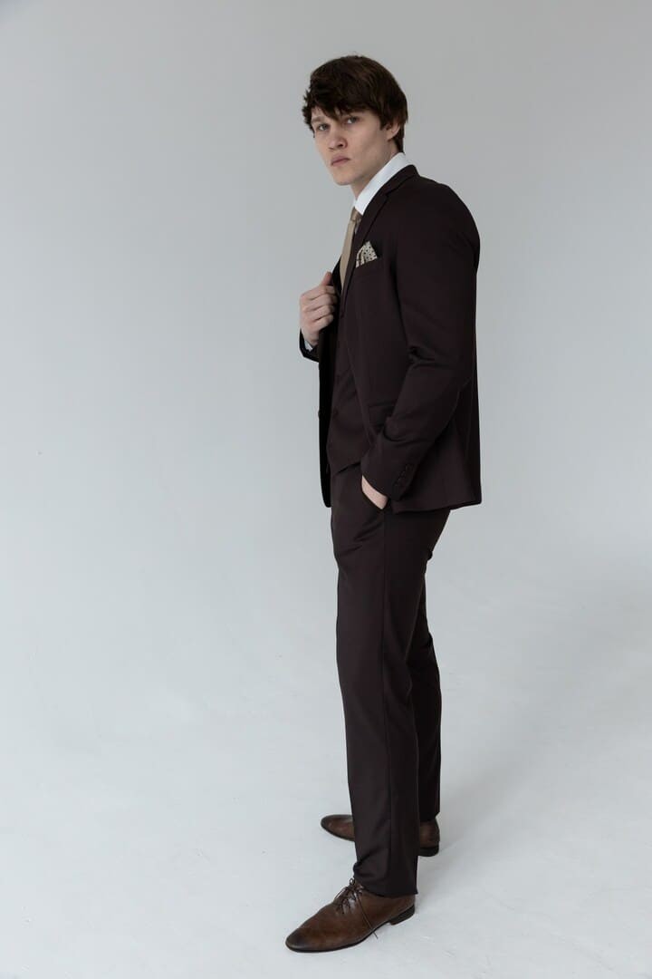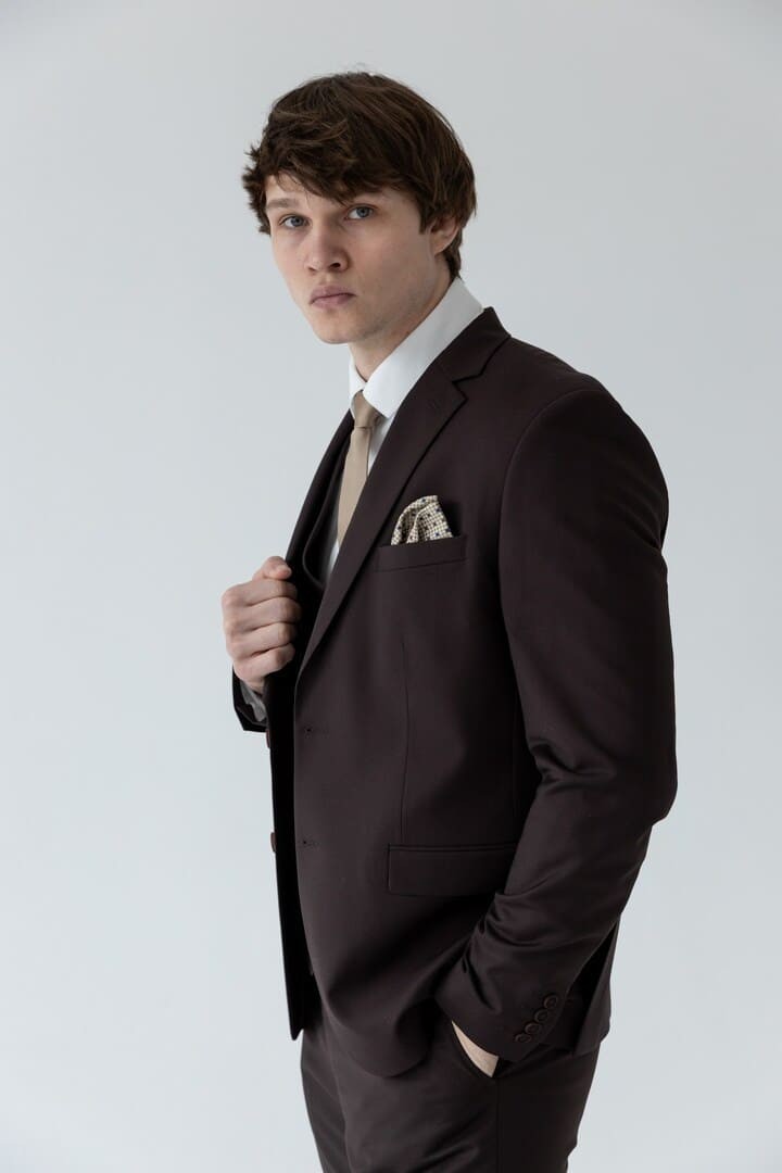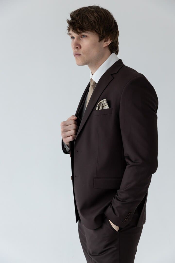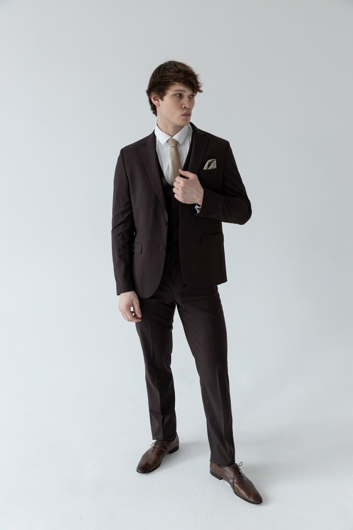 Тёмно-коричневый костюм-тройка — это сдержанная роскошь, воплощённая в ткани. Его глубокий, тёплый оттенок словно создан для тех, кто ценит классику, но не хочет теряться в толпе серых и чёрных силуэтов.