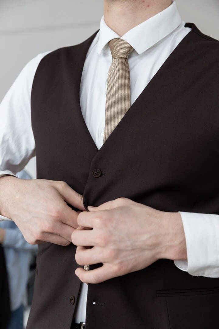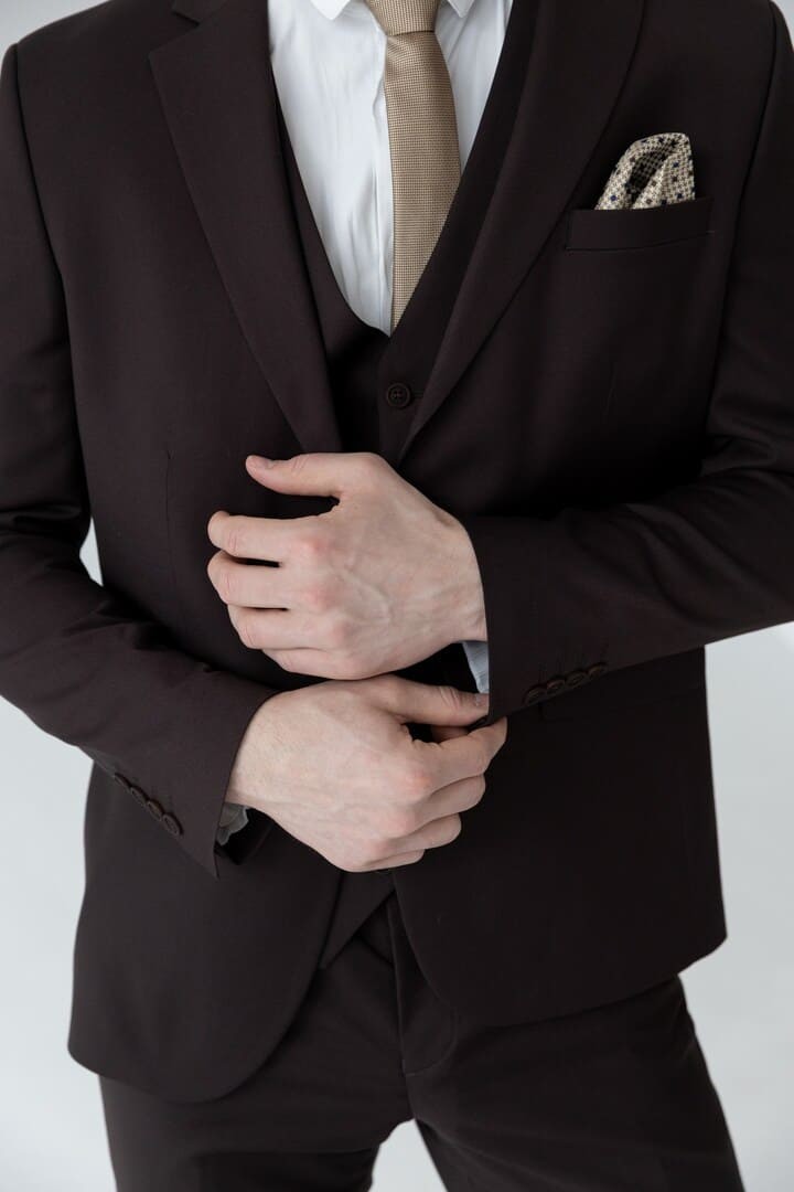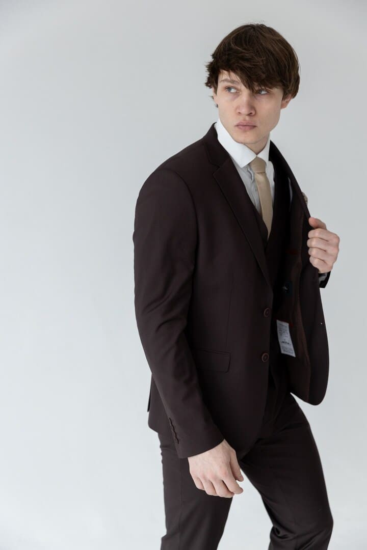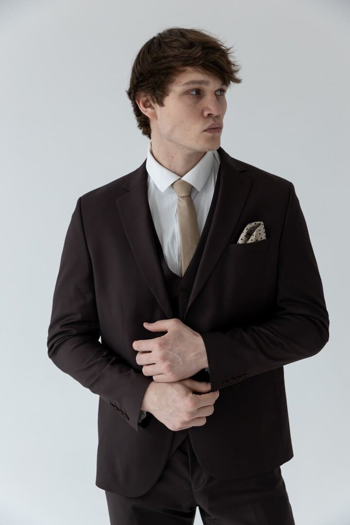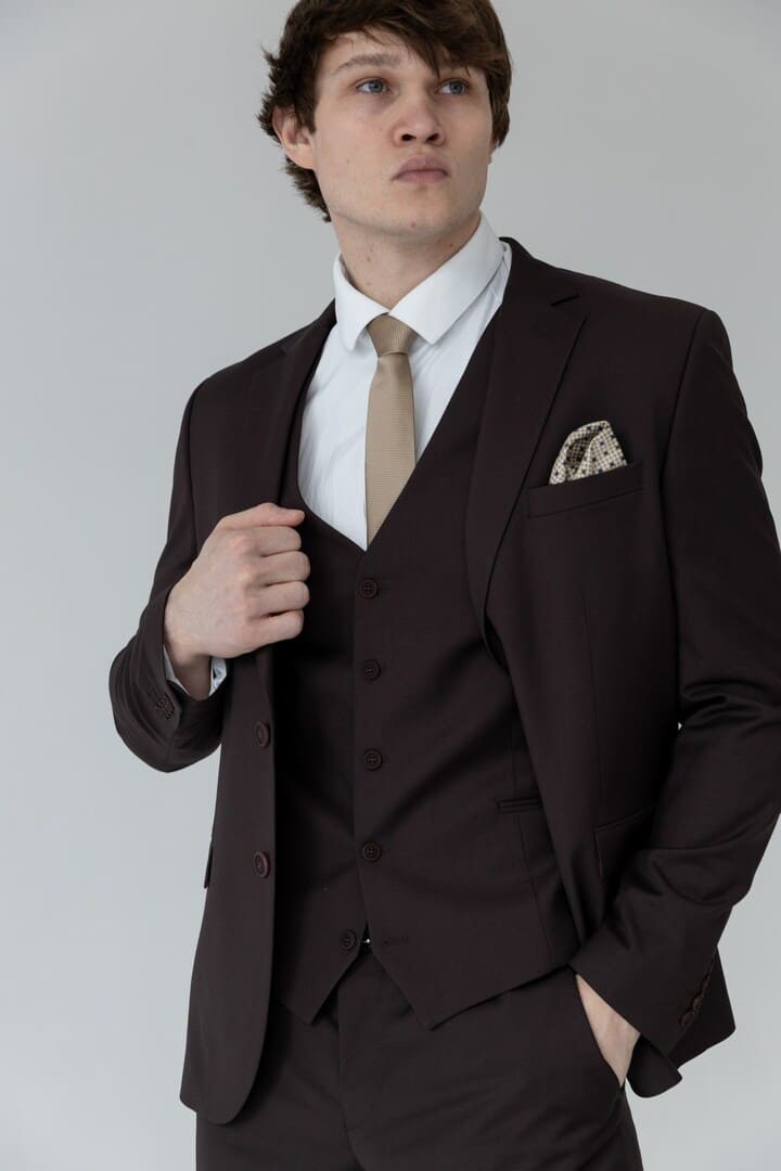 Тёмно-коричневый костюм-тройка — это сдержанная роскошь, воплощённая в ткани. Его глубокий, тёплый оттенок словно создан для тех, кто ценит классику, но не хочет теряться в толпе серых и чёрных силуэтов.